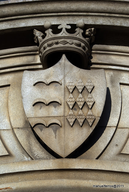 Escudo oval em cartela, ornado de paquife e elementos vegetalistas. Com coronel de nobreza. Esquartelado: I - Melo . II - Amaral. III - Castelo-Branco IV - Pais.