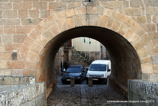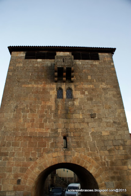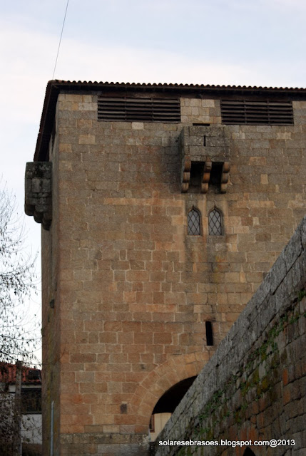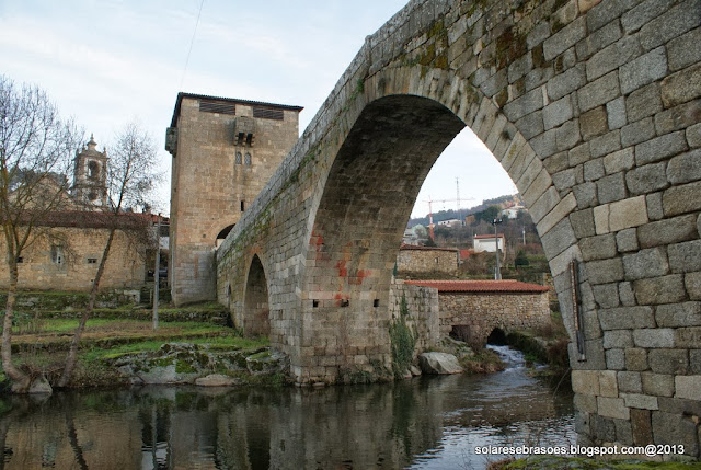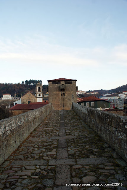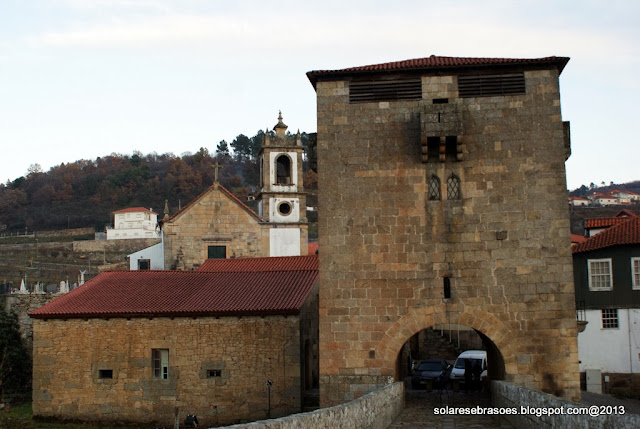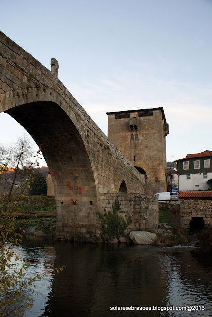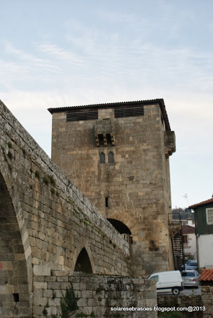 Num dos extremos da ponte abre-se o arco de volta perfeita da torre de proteção e de portagem, construção custeada pelo abade de Salzedas e que seria objeto de remodelação posterior. Esta imponente e robusta torre de granito apresenta uma forma quadrada, sendo marcada por janelas geminadas pequenas e ogivais, seteiras, balcões misulados e com sistema de mata-cães, terminando superiormente com aberturas de vigilância, cobertas por telhado de quatro águas com beiral. A sua porta é aberta num dos panos laterais e o seu acesso estabelecido por escadas de ferro gradeadas. Na face oposta à ponte rasga-se um pequeno nicho, no interior do qual se abriga uma escultura de N. Sra. do Castelo.